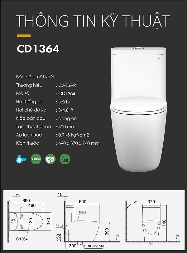 Nắp Bồn cầu 1 khối Caesar CD1364 được làm từ nhựa PP kháng khuẩn không màu, không mùi. Bề mặt nắp bồn cầu nhẵn mịn, dễ dàng vệ sinh, chống bám bẩn, tuổi thọ sử dụng lâu dài. Đặc biệt, đây là mẫu nắp rơi êm – nắp sẽ từ từ hạ xuống, không gây tiếng ồn như nắp bồn cầu thường.