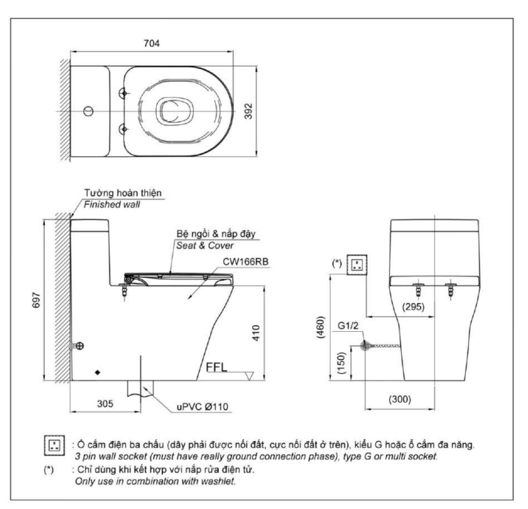 | Phụ kiện kèm theo | Phụ kiện lắp đặt, bao gồm bích nối sàn, van dừng |