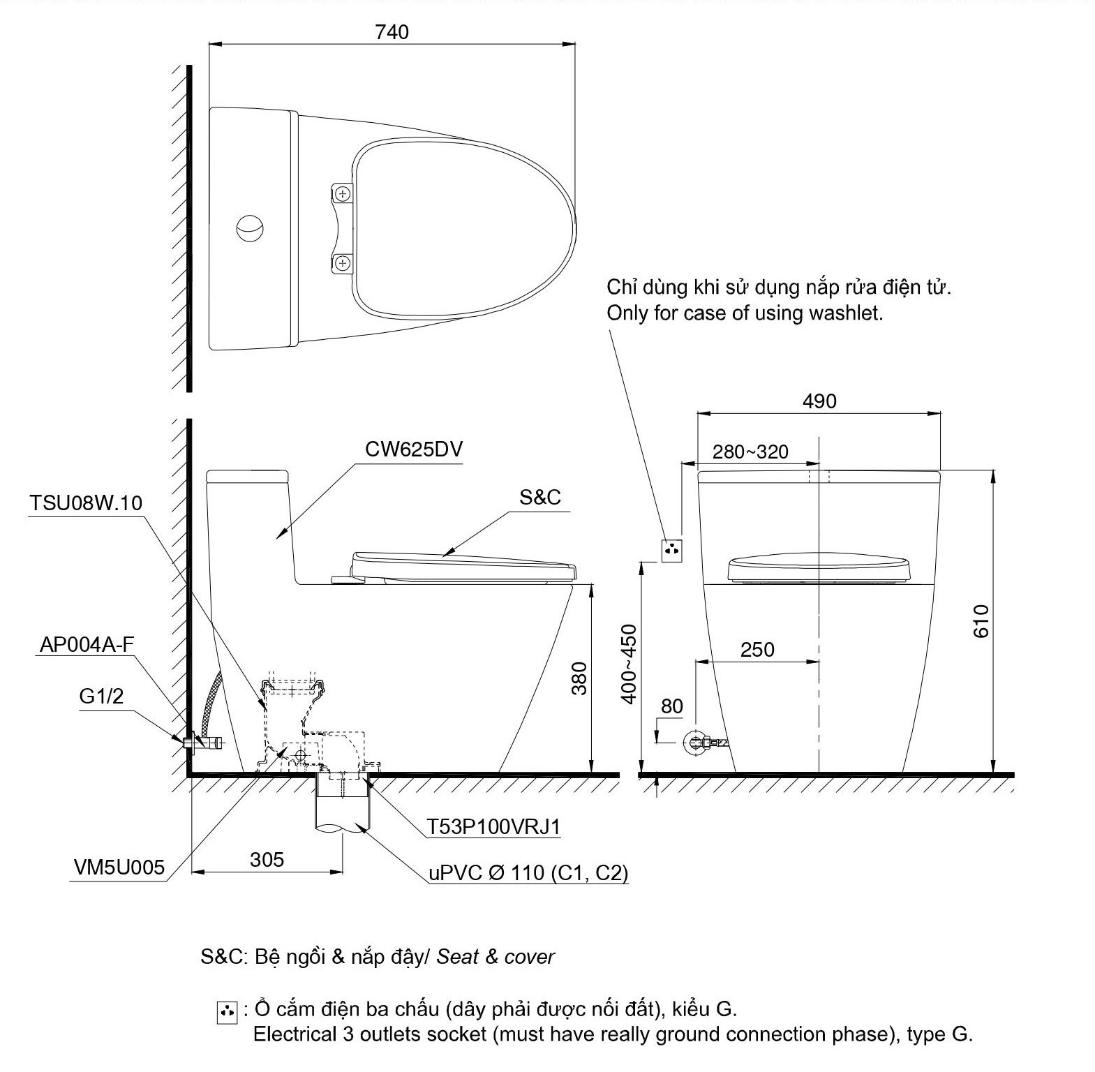 Bàn cầu 1 khối MS625với thiết kế vành kín, thân dài kết hợp nắp rửa điện tử WASHLET dòng S7 TCF4911Z hiện đại mang đến những trải nghiệm tiện ích cho người dùng.