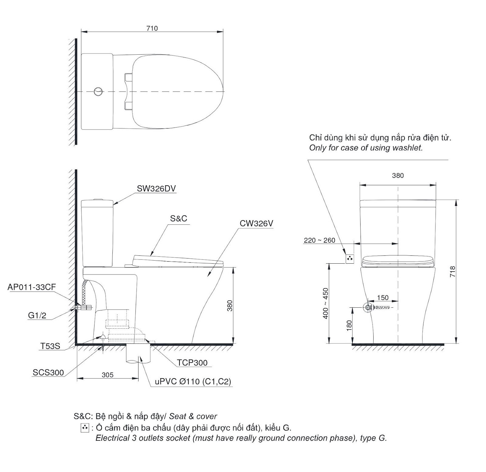 3. Thông số kỹ thuật của Bàn cầu hai khối CS326 kết hợp nắp rửađiện tử WASHLET dòng C5 TCF24410AAA