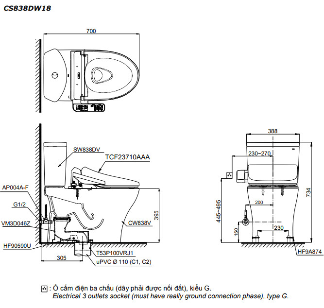 1. Mô tả chi tiết bàn cầu hai khối kèm nắp rửa điện tử WASHLET dòng C2 cơ bản CS838DW18