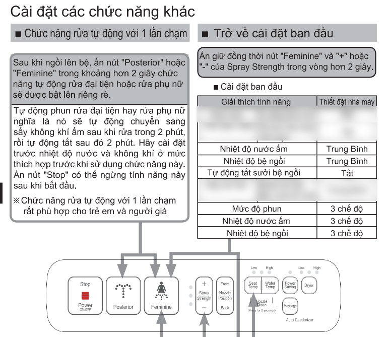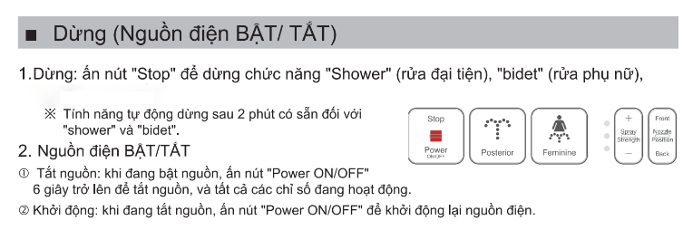 | Nhiệt độ nước ấm | OFF (nhiệt độ nước) - Thấp (~32 độ) - Trung bình thấp (~34 độ) - Trung bình (~36 độ) - Trung bình cao (~38 độ) - Cao (~40 độ) |