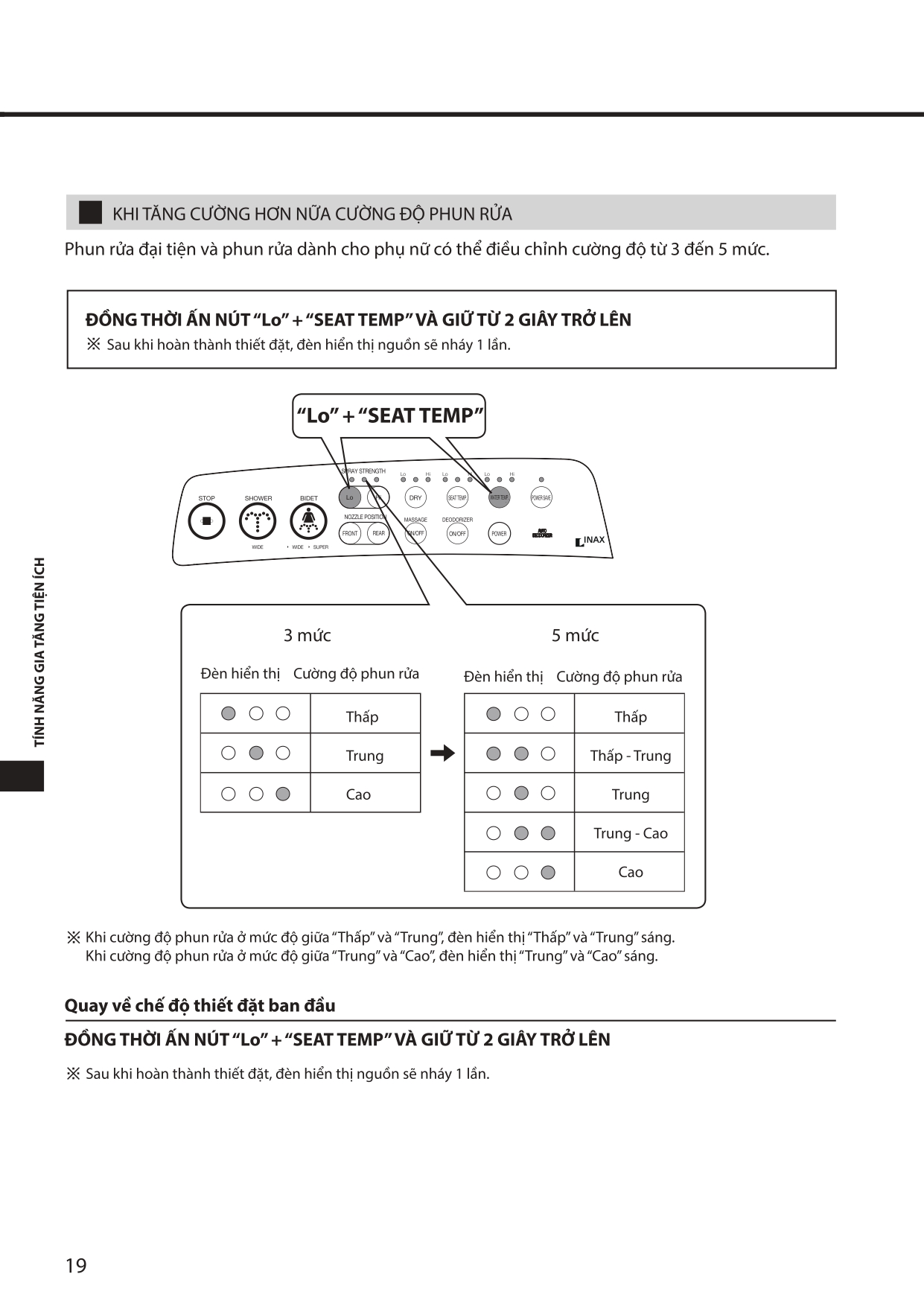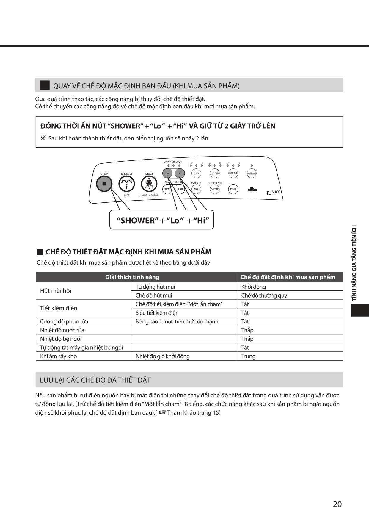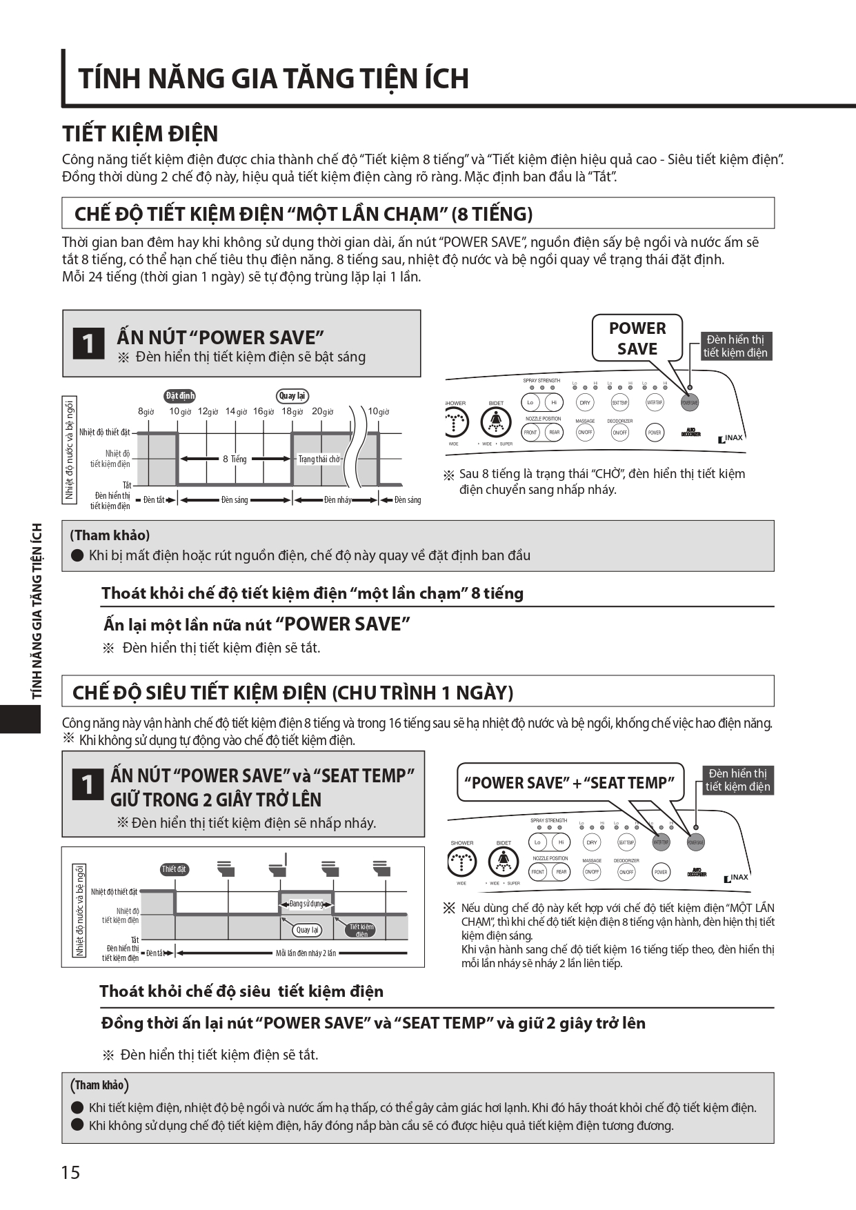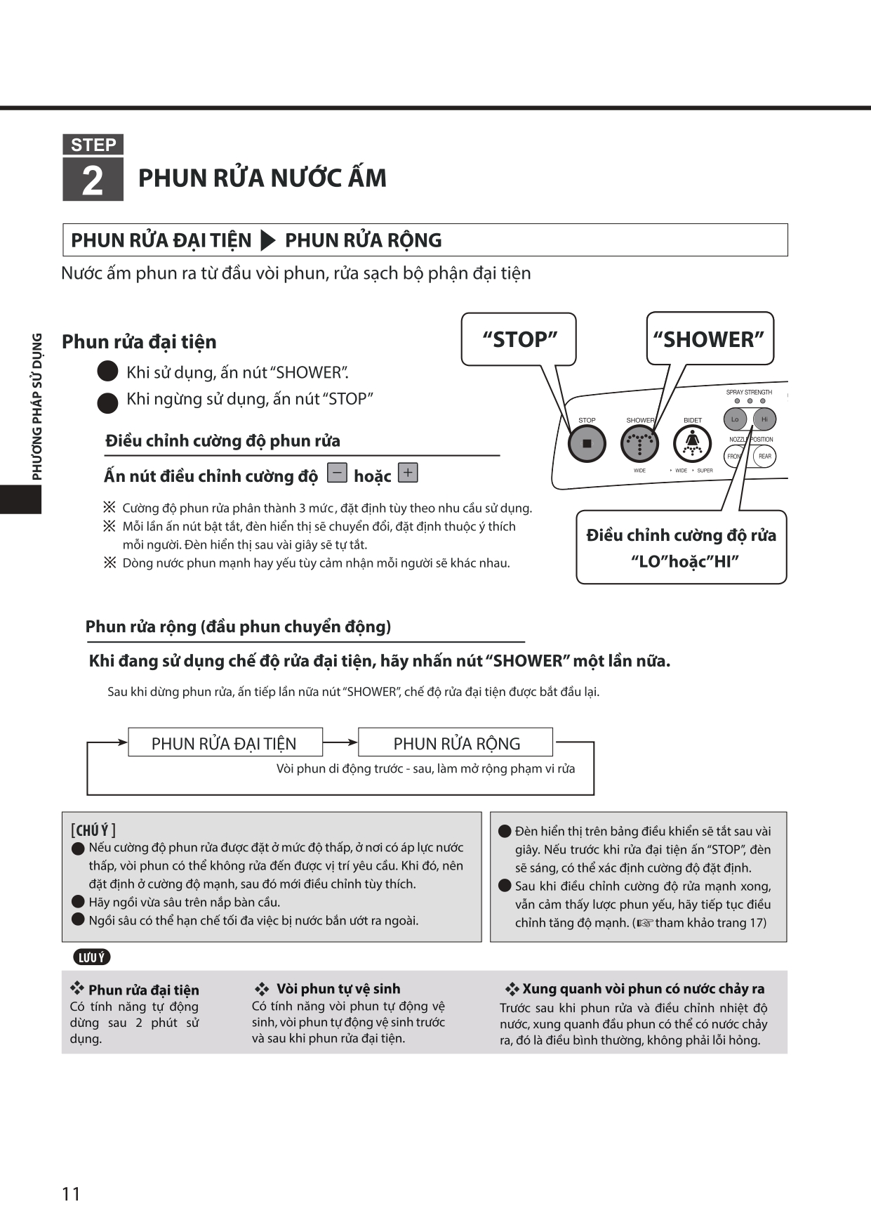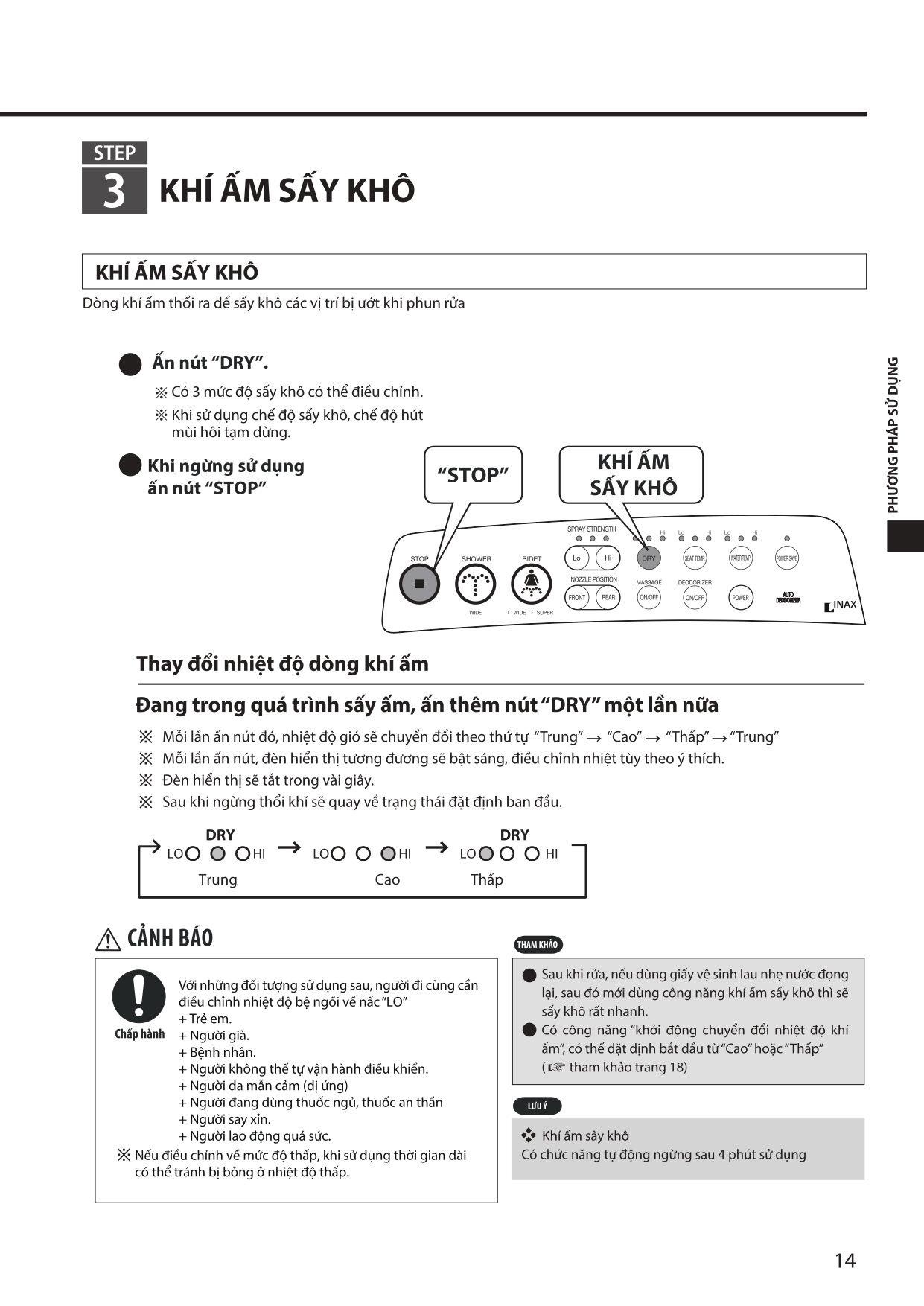 | Nhiệt độ nước ấm | OFF (nhiệt độ nước) - Thấp (~32 độ) - Trung bình thấp (~34 độ) - Trung bình (~36 độ) - Trung bình cao (~38 độ) - Cao (~40 độ) |