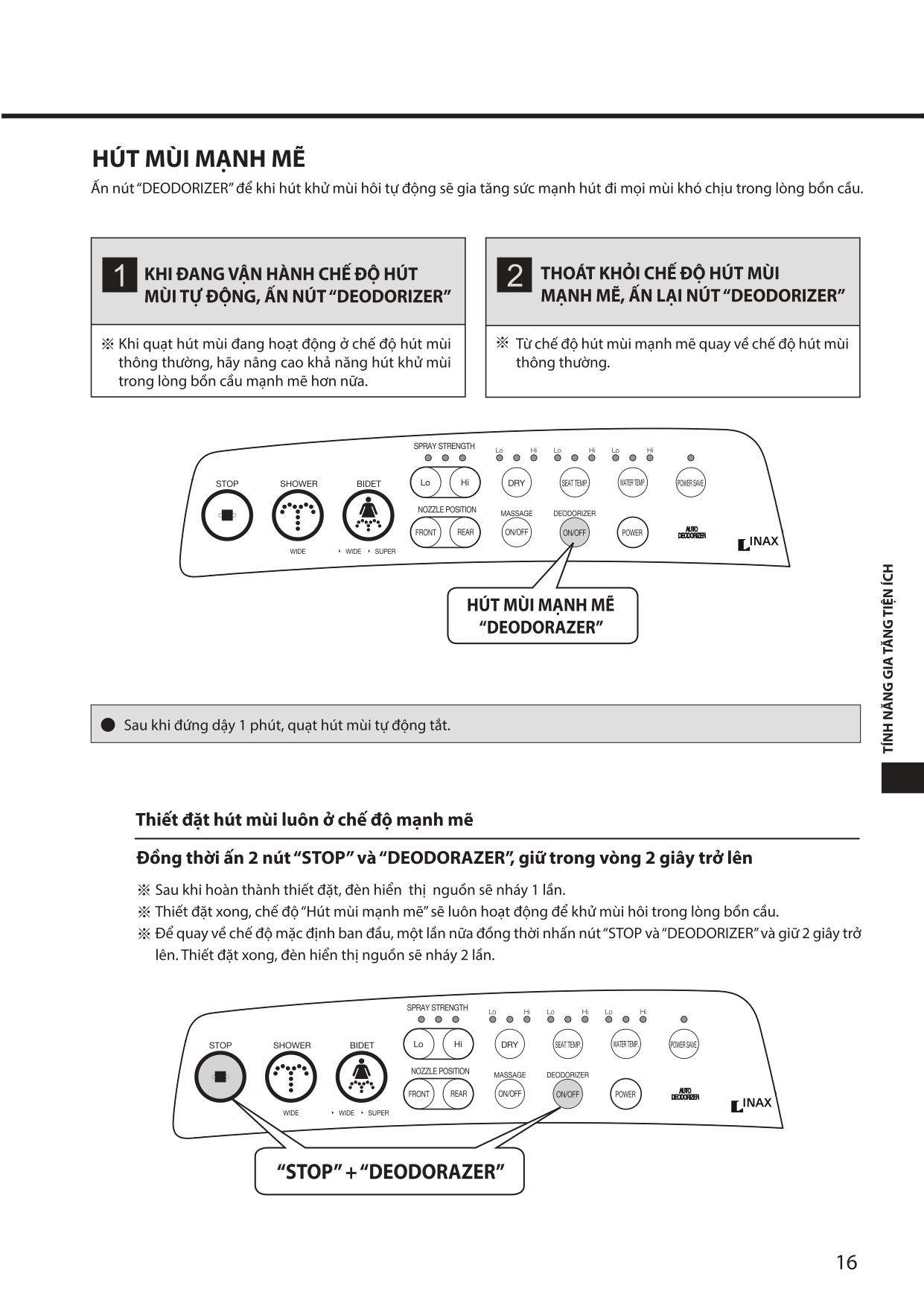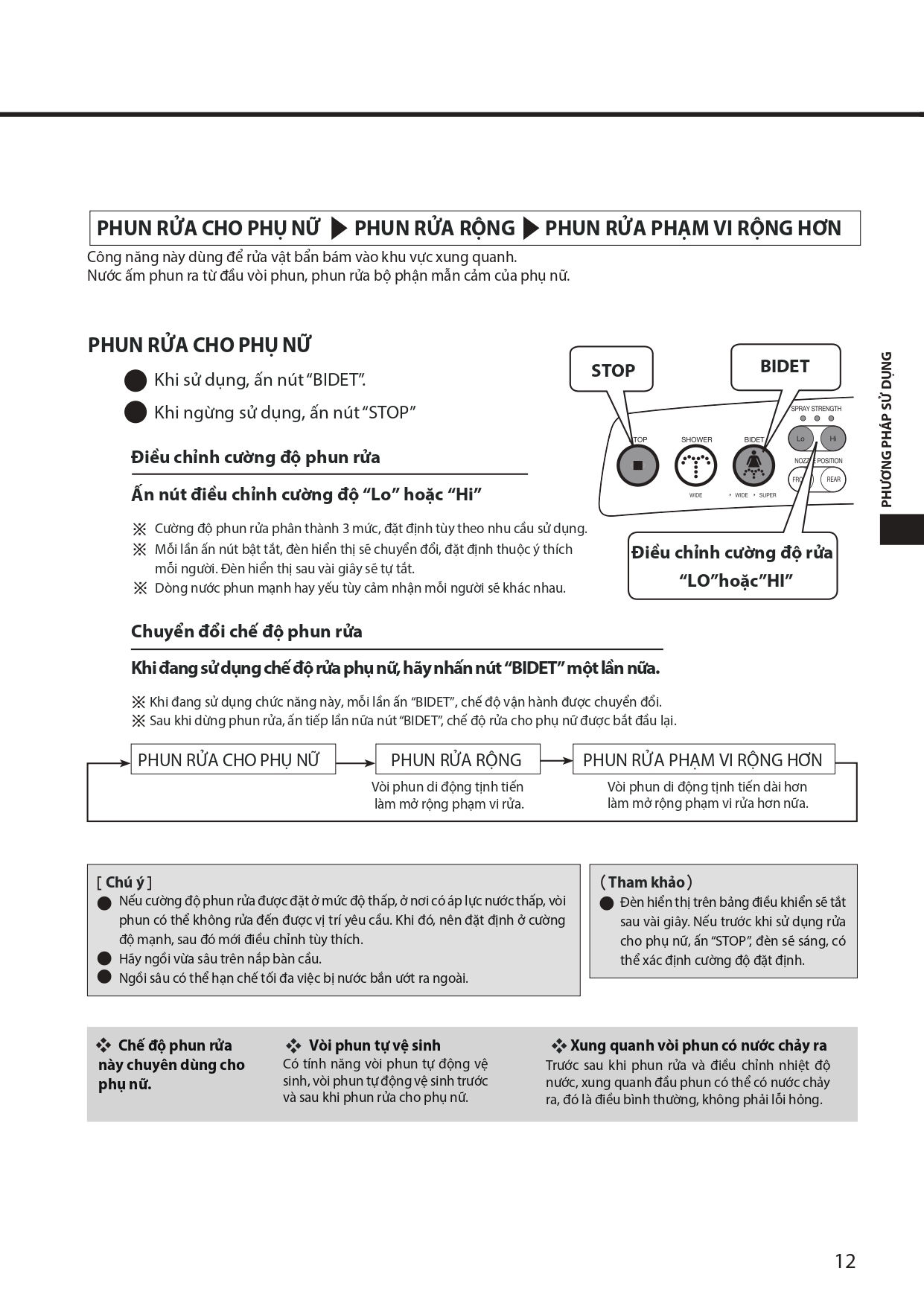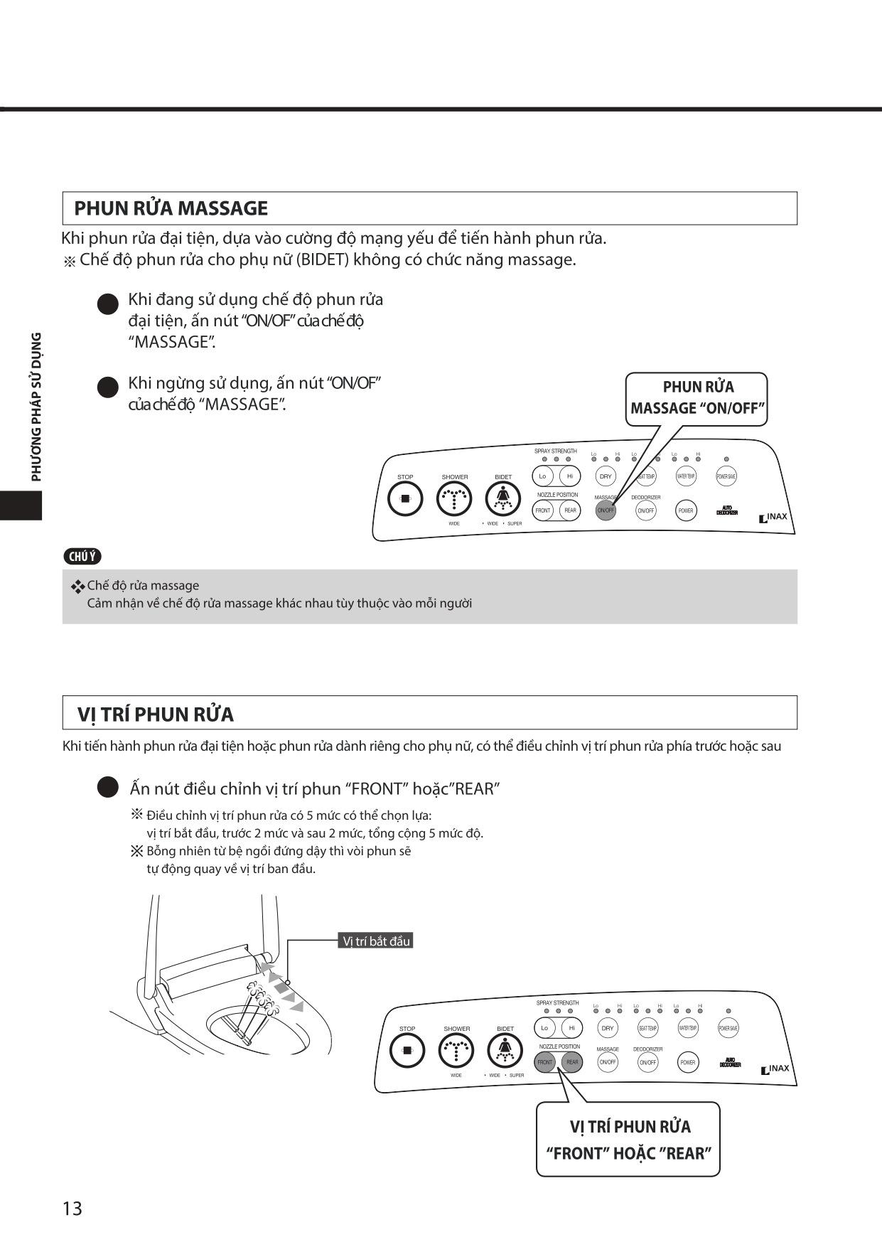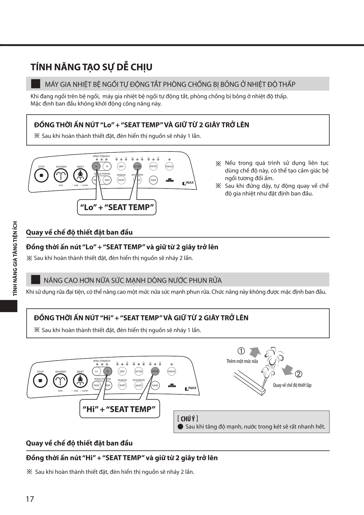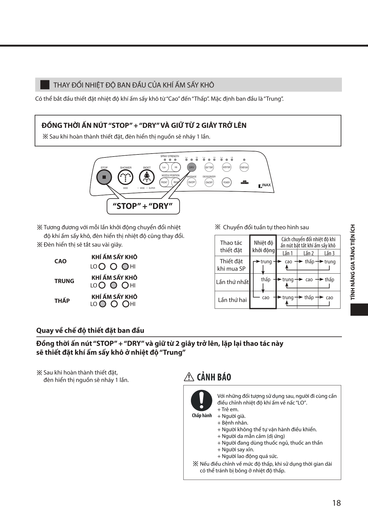 | Nhiệt độ nước ấm | OFF (nhiệt độ nước) - Thấp (~32 độ) - Trung bình thấp (~34 độ) - Trung bình (~36 độ) - Trung bình cao (~38 độ) - Cao (~40 độ) |