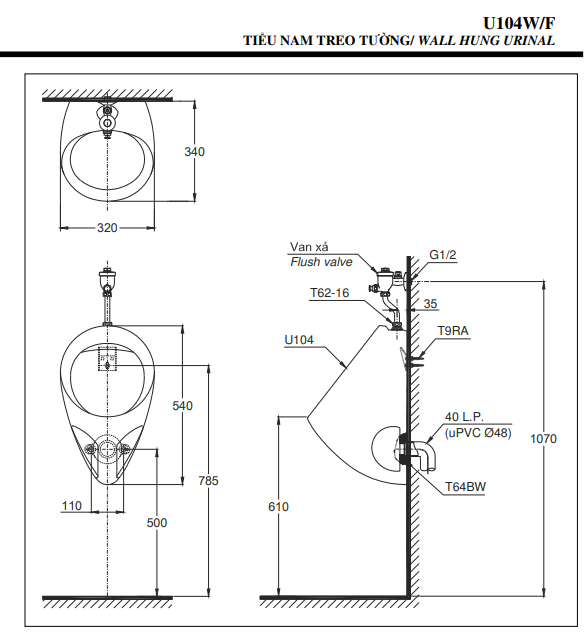 Bản vẽ kỹ thuật Bồn tiểu nam TOTO U104W treo tường