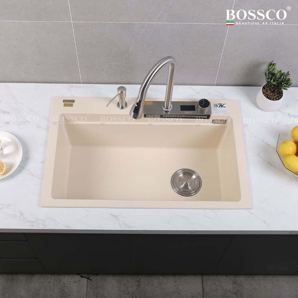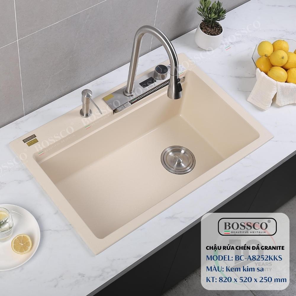 Chậu rửa chén đá BOSSCO BC-A8252KKS 1 hộc 2 phím đa năng là lựa chọn lý tưởng cho những gia đình cần một mẫu chậu gọn gàng – sang trọng – bền bỉ – tiện nghi. Với chất liệu Granite nhập khẩu Italia, màu kem kim sa tinh tế, thiết kế hộc sâu cùng vòi 2 phím hiển thị nhiệt độ hiện đại, sản phẩm mang lại trải nghiệm sử dụng an toàn và hiệu quả lâu dài cho mọi không gian bếp.