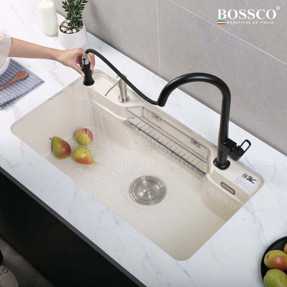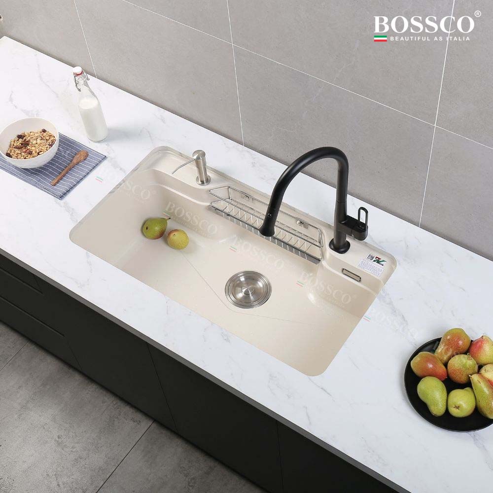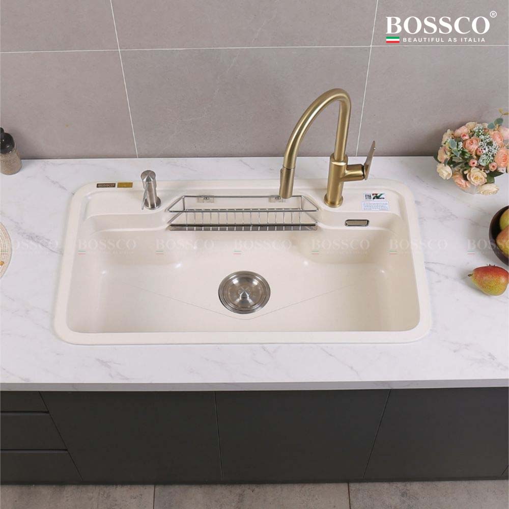 Chậu rửa chén đá BOSSCO BC-G9050TKS 1 hộc bo góc là lựa chọn lý tưởng cho những gia đình cần một mẫu chậu bền bỉ – an toàn – dễ vệ sinh – thẩm mỹ cao. Với chất liệu Granite nhập khẩu Italia, thiết kế bo góc tinh tế, màu trắng kim sa sang trọng cùng bộ phụ kiện đầy đủ, sản phẩm mang đến trải nghiệm sử dụng tiện nghi và nâng tầm không gian bếp.