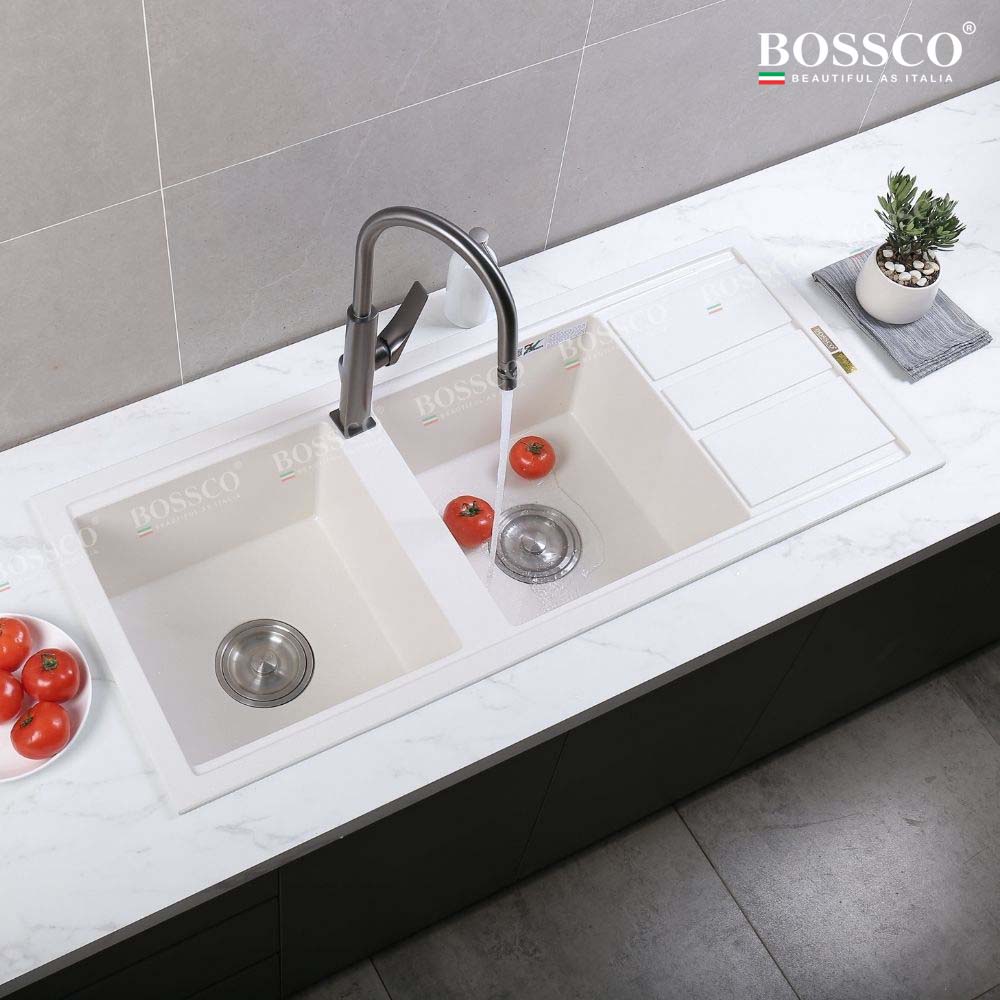 Chậu rửa chén đá BOSSCO BC-XT11650TKS 2 hộc cánh là sự lựa chọn hoàn hảo cho những gia đình mong muốn một mẫu chậu sang trọng – bền bỉ – tiện nghi – dễ vệ sinh. Với màu trắng kim sa tinh tế, thiết kế hai hộc phân vùng thông minh, chất liệu Granite cao cấp và khả năng chịu nhiệt – chịu lực vượt trội, sản phẩm mang lại trải nghiệm sử dụng tuyệt vời trong mọi không gian bếp.