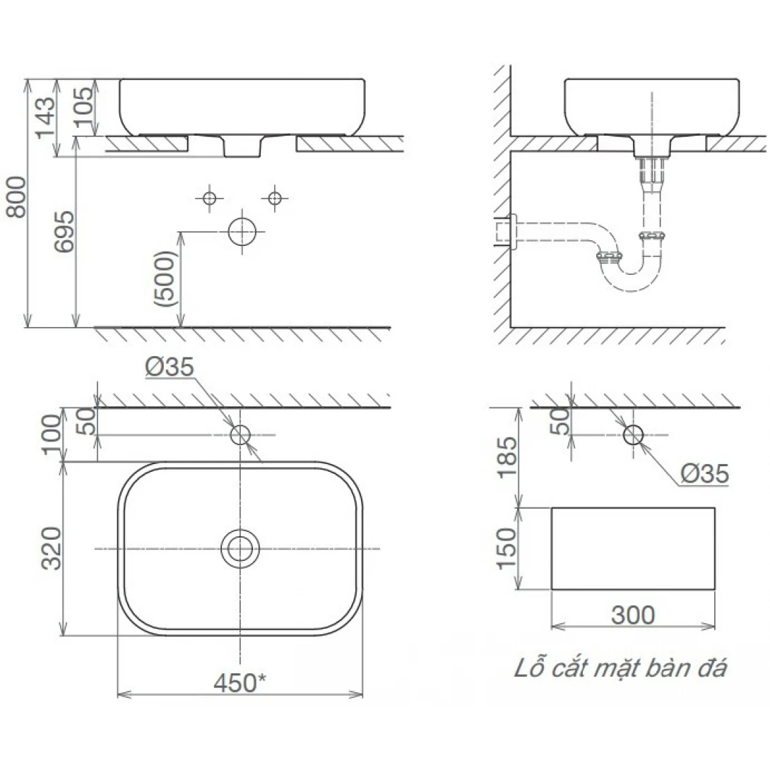 Bản vẽ kỹ thuật Lavabo chậu rửa mặt Viglacera V25 đặt bàn