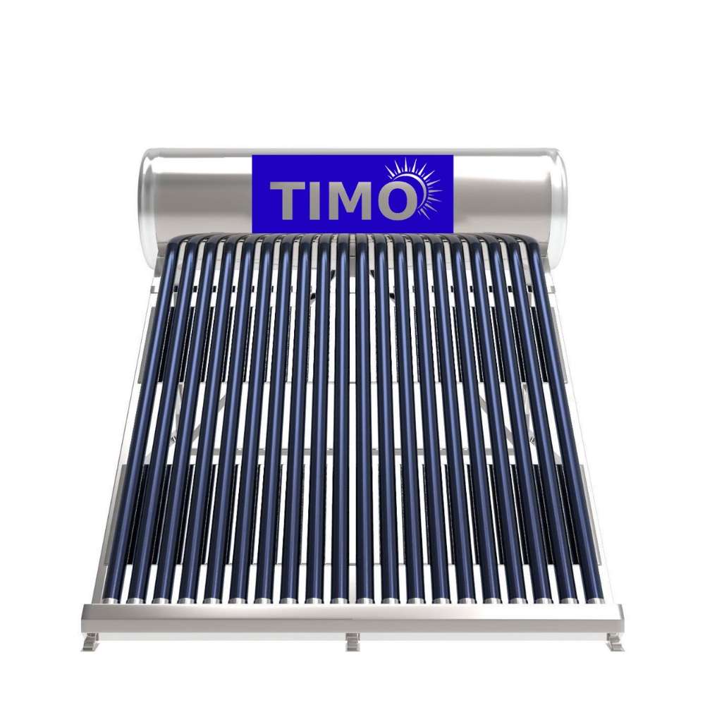 Máy nước nóng năng lượng mặt trời Timo 200 lít I304 sử dụng Inox SUS 304 cho cả ruột và vỏ bình chứa – loại vật liệu cao cấp, chống rỉ sét, an toàn tuyệt đối với nguồn nước sinh hoạt. Khung chân bằng thép không gỉ giúp cố định máy vững chắc trên mái nhà, chịu tải trọng và thời tiết khắc nghiệt tốt.