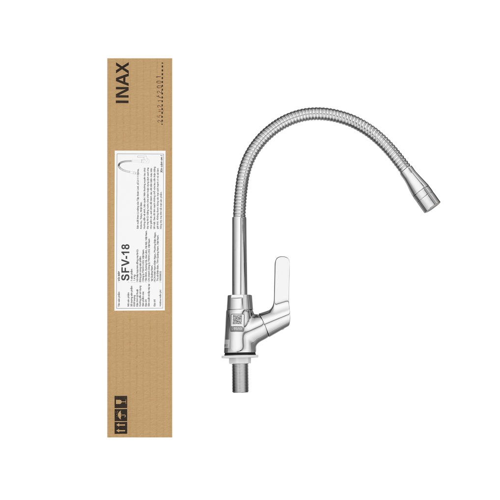 Vòi chậu rửa chén INAX SFV-18 nước lạnh sở hữu thiết kế cao, thoáng và hiện đại, với chiều cao tổng thể 325 mm và chiều rộng ngang 231 mm, rất thích hợp cho các loại bồn rửa sâu và rộng.