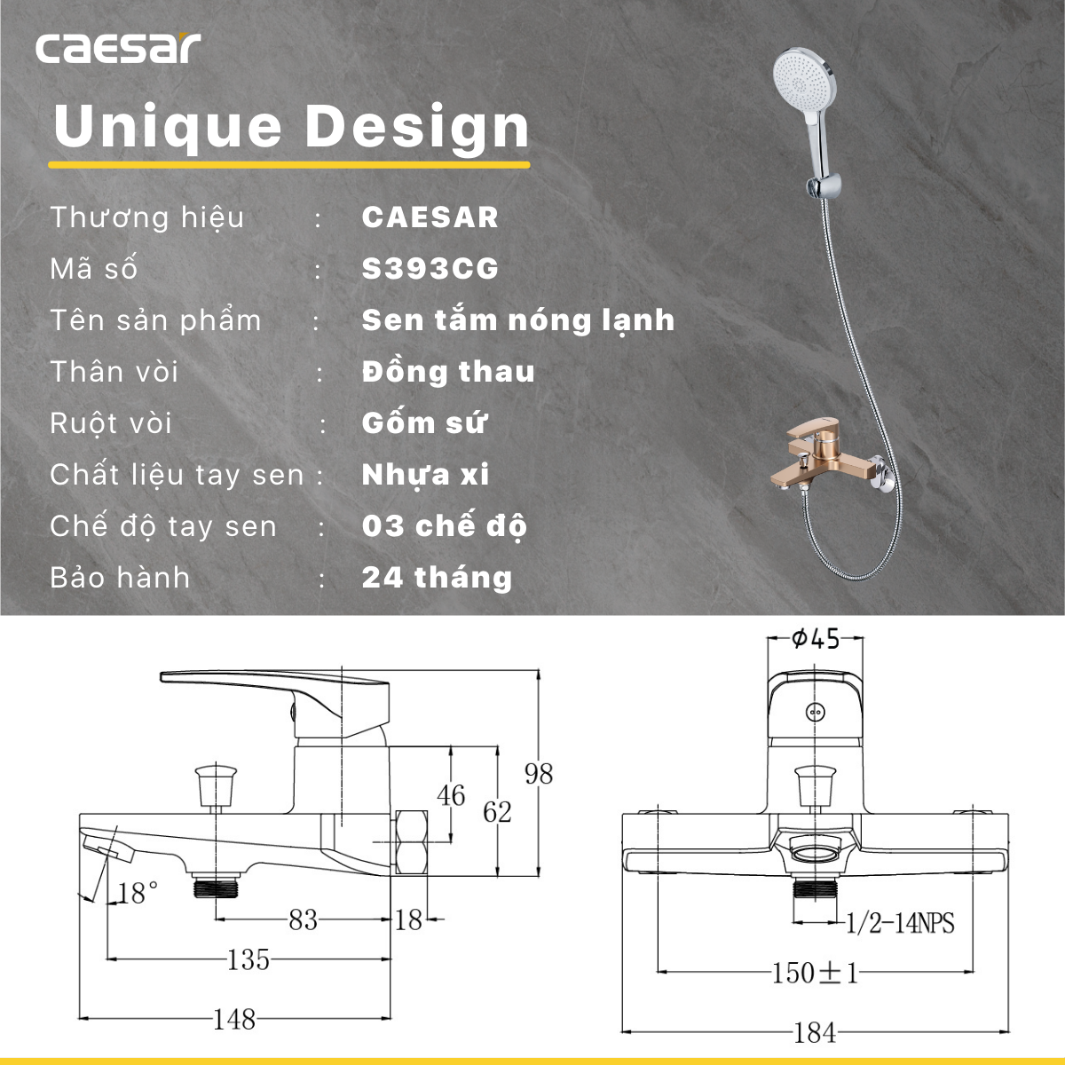 - Tên sản phẩm: Vòi sen nóng lạnh Caesar S393CG